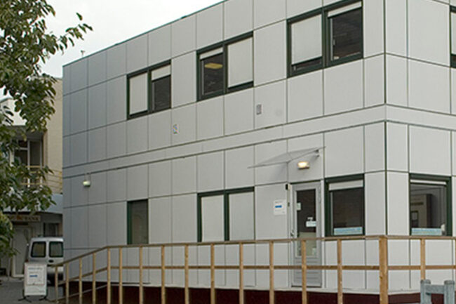 Strak, helder en iconisch. Dit tijdelijke bankgebouw in Veghel valt direct op door zijn rechte lijnen en geometrische vormen. De gevels zijn volledig bekleed met lichtgrijze UniKern® biobased compactplaten, wat zorgt voor een frisse, moderne uitstraling.