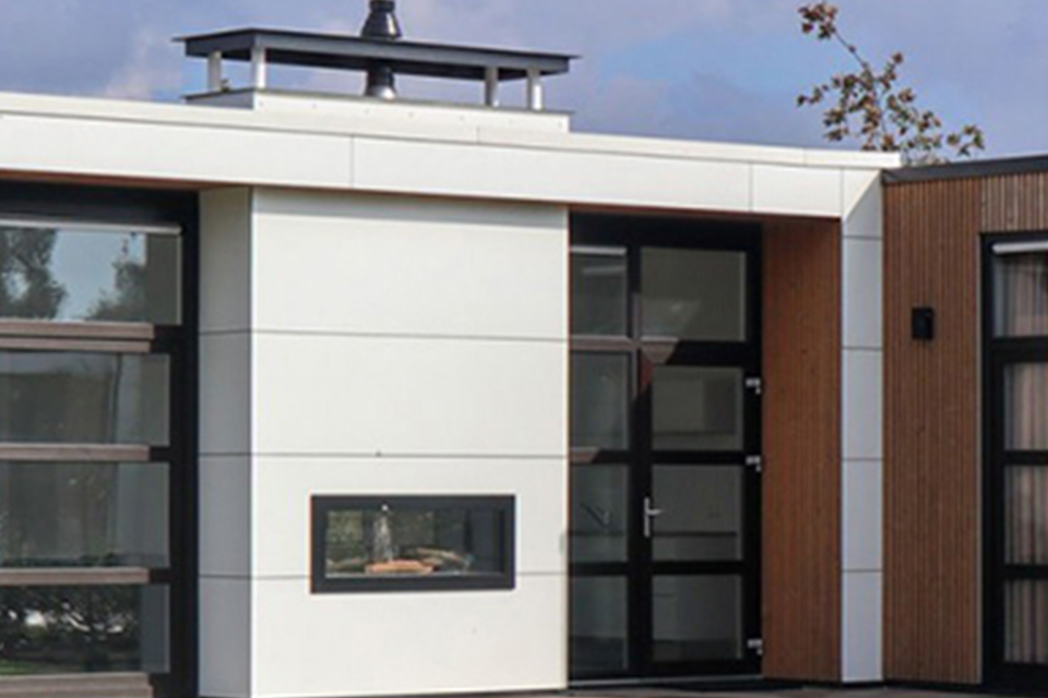 Fris wit in combinatie met hout, de perfecte mix voor een modern droomchalet. Zowel de gevels als de boeiboorden zijn bekleed met UniKern® compactplaten in wit. Het hout zorgt voor warme accenten en versterkt de eigentijdse, frisse uitstraling.