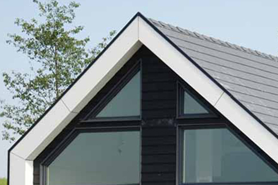 Die witte omlijsting, uitgevoerd in UniKern® biobased compactplaten, kaderen de woning en geven diepte aan het ontwerp. Het zwart-witthema zorgt voor rust, eenheid en een verrassend moderne touch binnen een landelijke setting.